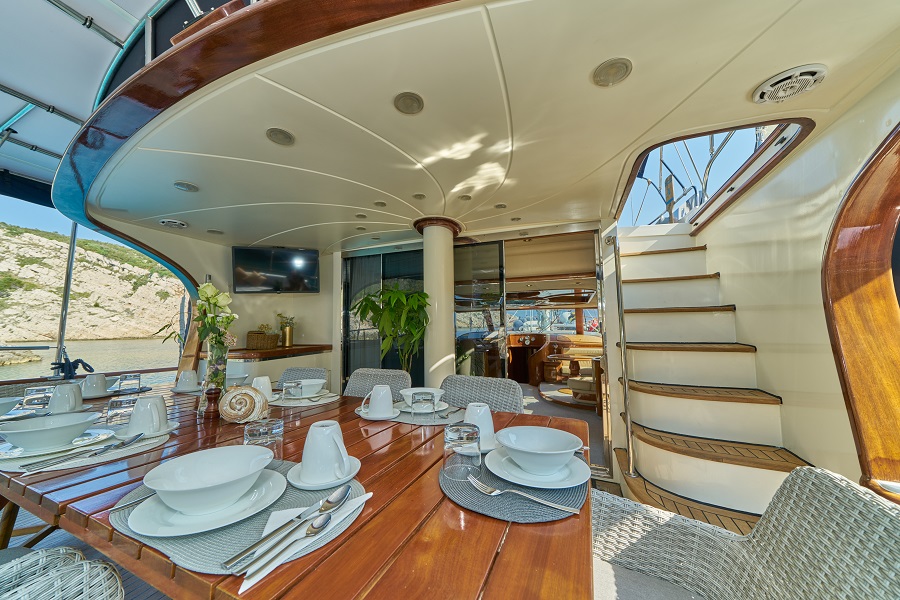 The decks of the boat were made for relaxation and enjoyment. On the stern deck there is comfortable dining room al fresco surrounded by cushioned seating. The deck is also equipped with a TV which is situated right next to the outside dining area thus creating a perfect place to sit back in a comfortable chair, sip a drink and enjoy watching TV.