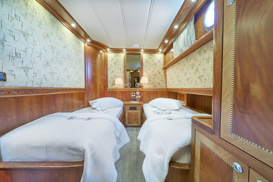 Stepping inside this impressive boat, you will find yourself in one of the most beautiful designed salons you have ever seen. Guests will enjoy spending time gathered around the table in comfortable lounge area with cushioned seats and sofas. There is also a special tea & coffee table surrounded with nice sofa. It has large panoramic windows, so the salon looks very airy and spacious. Guests are accommodated in 4 ensuite cabins, 1 master cabin, 1 VIP cabin, 1 double cabin and 1 twin cabin. Each of 4 cabins ensures a lot of storage space.
